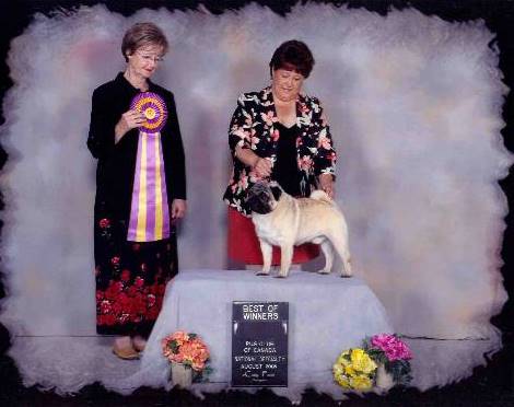 Berry produced one litter of 7 for us. Although the girl delivered early we had 4 pups that survived. Three became AM Champions, and one of them, Tira, became an AM/CAN champion and became a Nationally ranked special with more Best of Opposite win that year than any other Pug. He's frozen semen has now been DNA tested. These tests were not available before he passed.