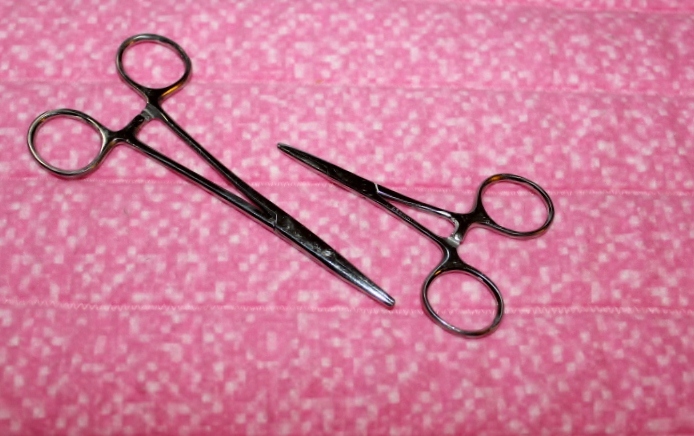 14. 5 ½” & 6 ½” Straight Locking Hemostats: For clamping umbilical cords before cutting. Leave forceps on for few minutes to minimize bleeding from stump. I use the 6” size to clamp on the cords below the vulva, when the placenta isn’t delivered with the pup. The 5 ½” size to clamp close to the pup. I will cut the cord and leave the small clamp on the pup until I have the puppy going and nice a pink a squealing.